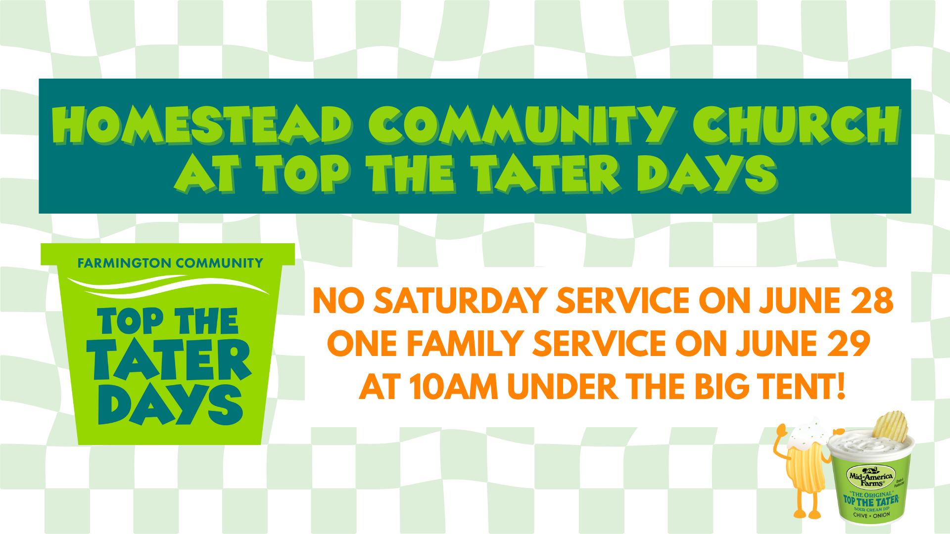 Join Homestead Community Church for a service for the whole family under the Big Tent! We'll have music, teaching for the kids and an encouraging message for the whole family. Come by before you get your spot for the parade!