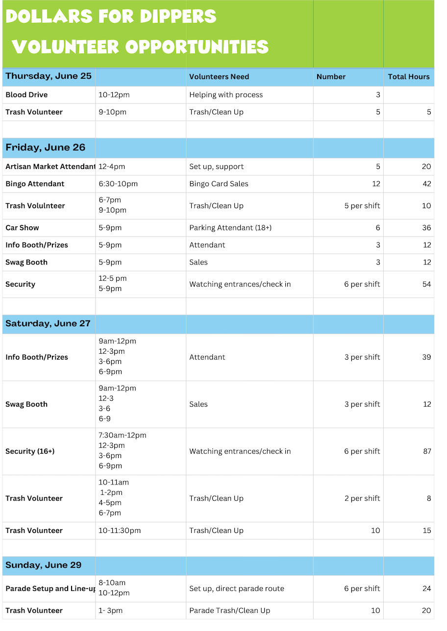 DOLLARS FOR DIPPERS VOLUNTEER OPPORTUNITIES